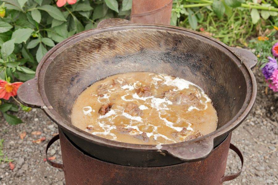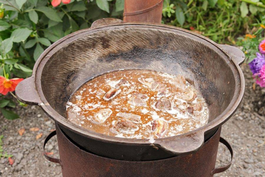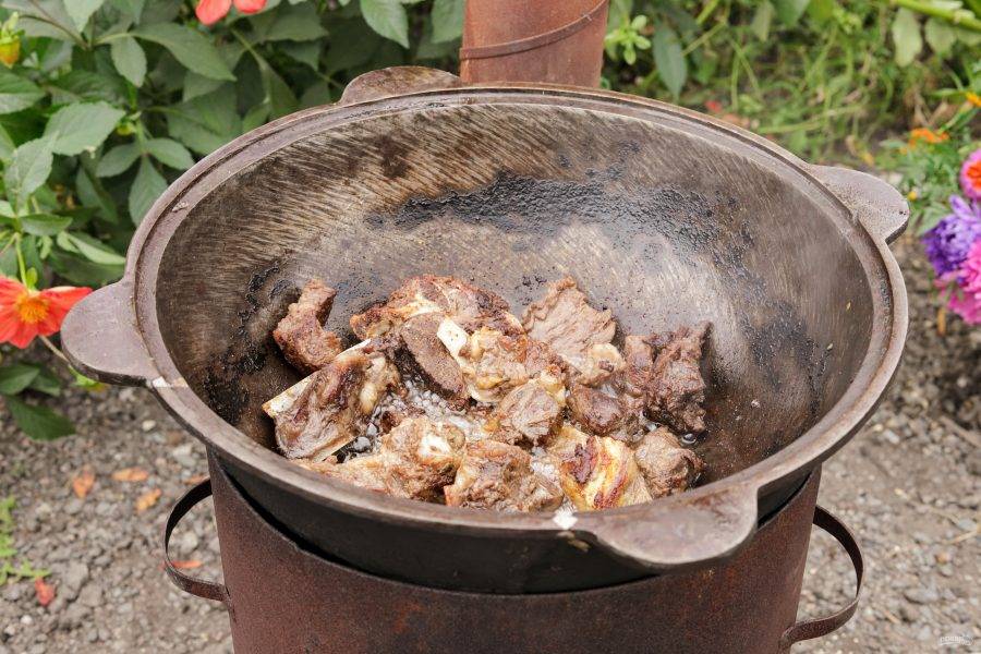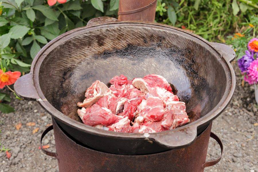 Разведите костёр, используя поленья или какие-либо древесные отходы. Разместите над ними в специальном приспособлении казан. Всё дно и стенки казана изнутри смажьте растительным маслом, пригодным для жарки. Налейте масло, накалите его и выложите рубленное на куски мясо (мясо предварительно промойте и обсушите).