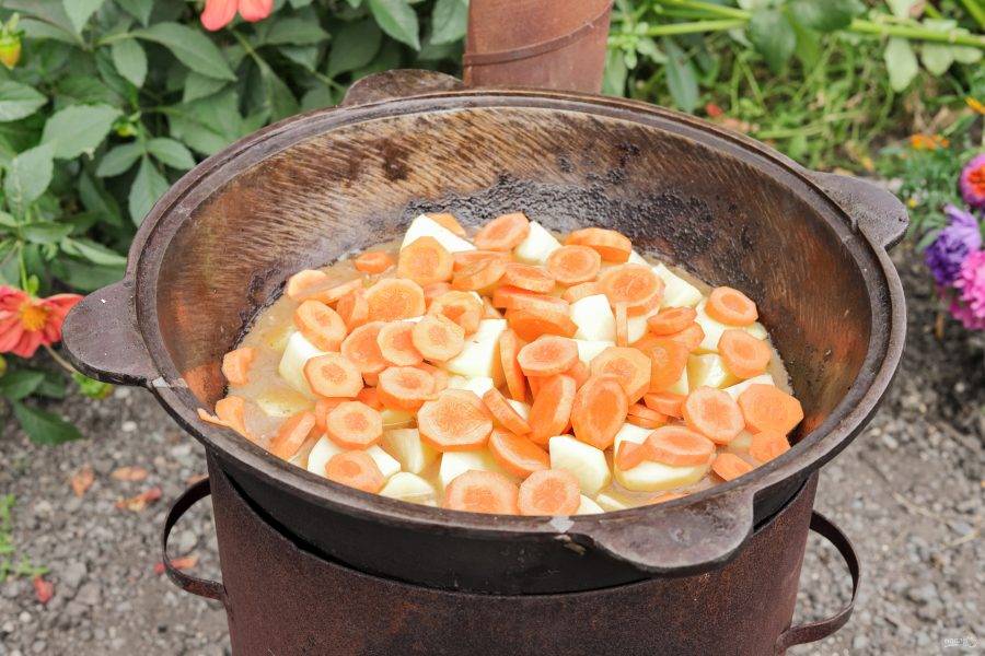Так же добавьте морковь, которую можно нарезать кружочками или небольшими брусками.
