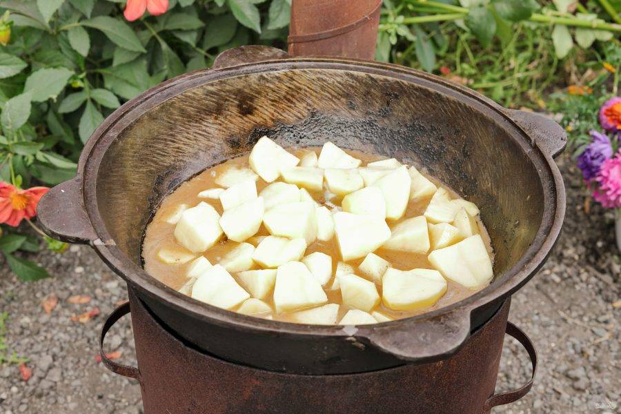 Когда мясо станет мягким, добавьте нарезанный крупными кусками картофель.