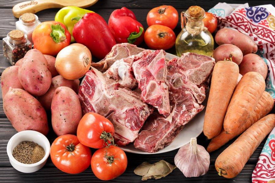 Подготовьте все ингредиенты по списку. Можно взять как баранину, так и говядину — любые части, но желательно с костью.