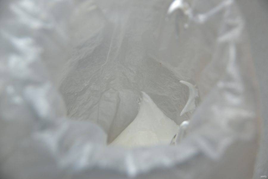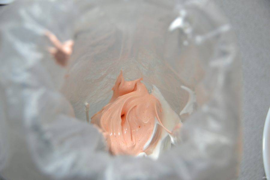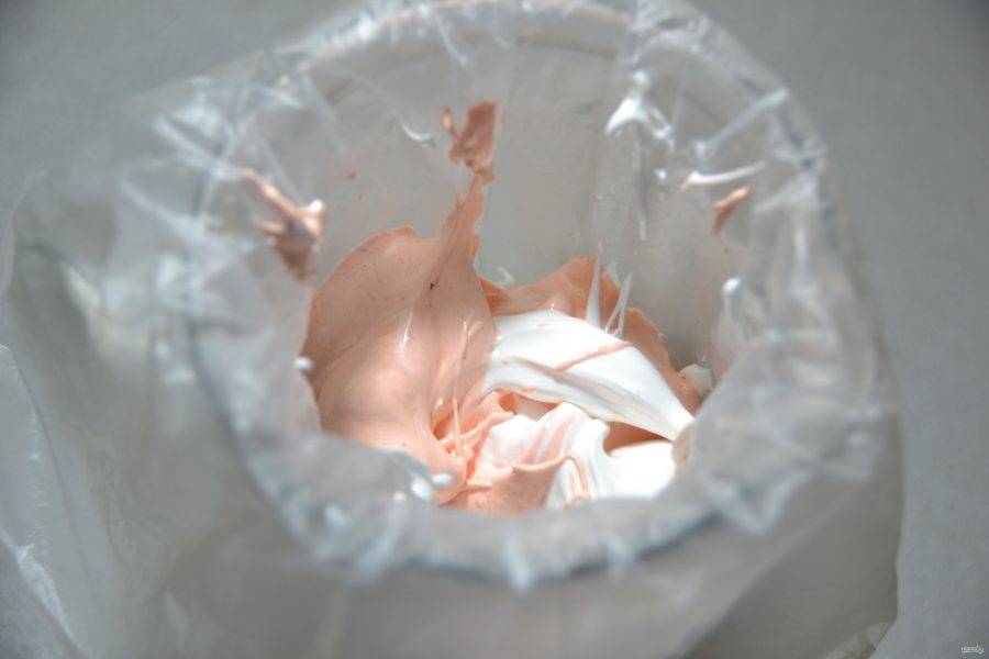 В кондитерский мешок выкладывайте поочередно: столовую ложку белой меренги.