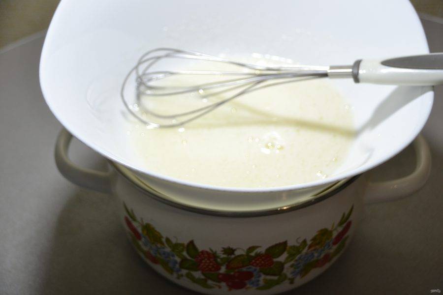 Поставьте сахарно-белковую массу на "водяную баню" и нагрейте до 70 градусов, постоянно помешивая.