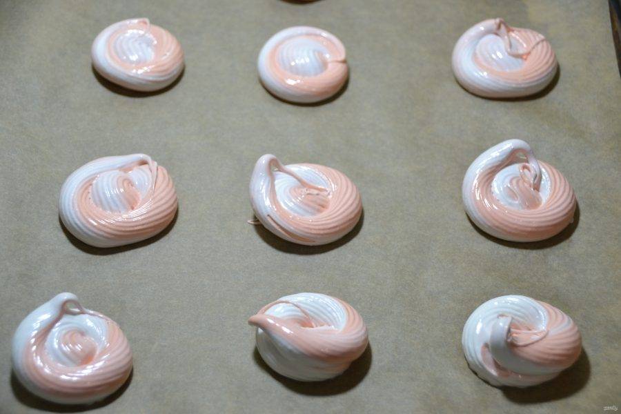 На лист пергамента отсадите через насадку всю массу, оставляйте между меренгой расстояние.