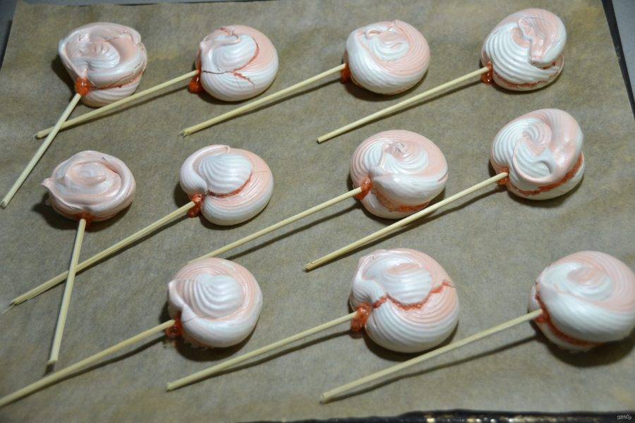 Сушите меренгу в духовом шкафу на минимальном огне 1,5 часа, при этом держите дверцу духовки слегка приоткрытой.