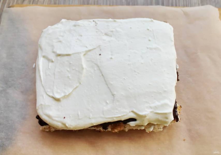 Смажьте один бисквит со стороны шоколада частью крема и выложите второй бисквит.