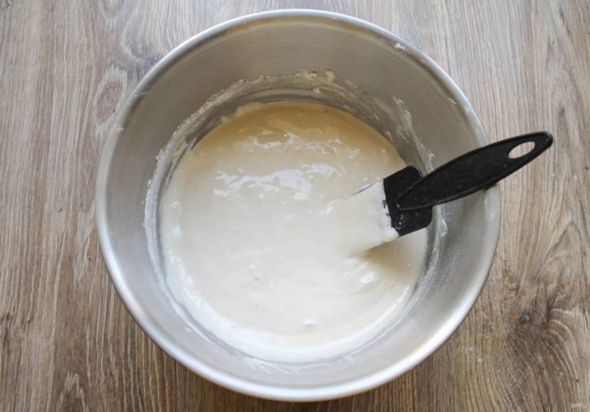 Смешайте муку с разрыхлителем и просейте ее во взбитую массу. Аккуратно перемешайте снизу вверх до однородного теста.