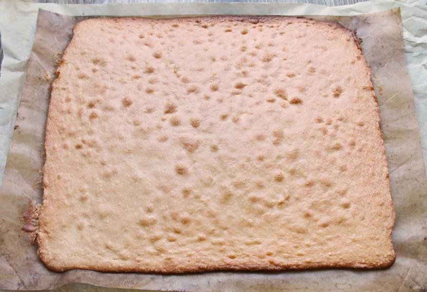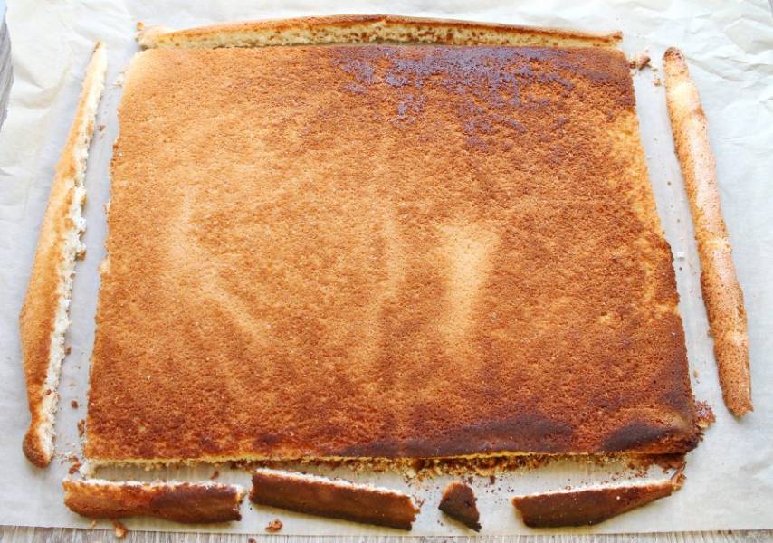 Достаньте готовый бисквит и переверните на другой лист бумаги. Аккуратно снимите лист бумаги, на котором выпекали. Ровно обрежьте стороны и разрежьте на три части. Полностью остудите.