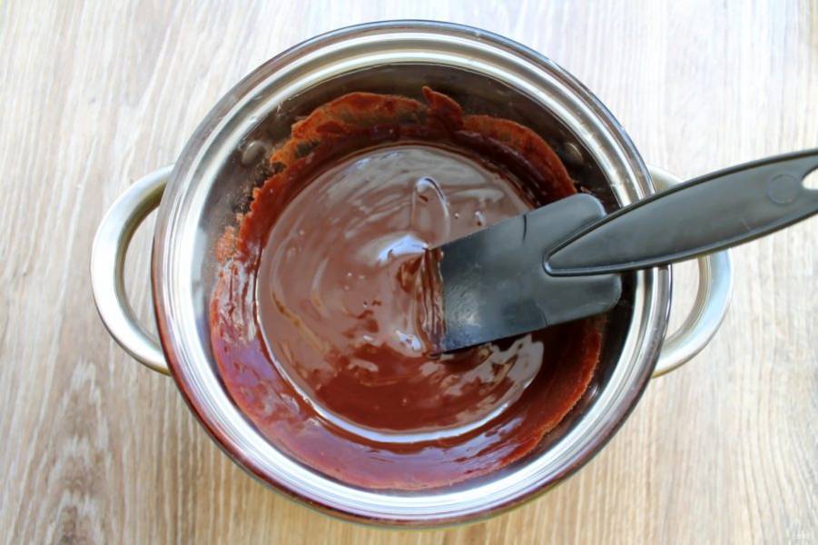 Темный шоколад поломайте и выложите в миску. Добавьте к нему сливочное масло и одну ложку коньяка. В кастрюлю налейте воду и доведите до кипения на среднем огне. Поставьте сверху миску с шоколадом, чтобы она не соприкасалась с водой. Перемешивая, все растопите до однородной массы.
