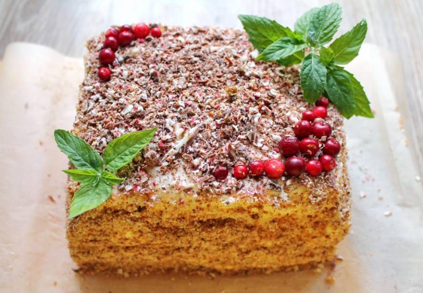 Бисквитные обрезки измельчите в крошку и обсыпьте все бока торта. Верх посыпьте какао и тертым шоколадом. Украсьте по своему вкусу, я украсила ягодами и мятой. Уберите в холодильник на несколько часов, чтобы крем стабилизировался.