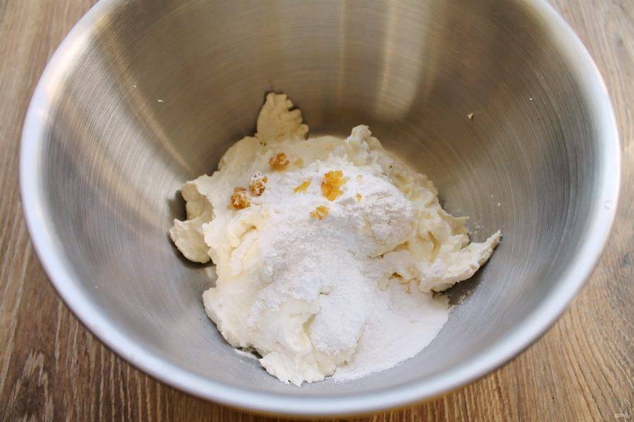 В чашу миксера выложите сливочный сыр, три столовых ложки сахарной пудры и цедру. Взбейте до однородной массы. Белый шоколад растопите на водяной бане и добавьте в сырную массу. Взбейте еще немного до однородности.