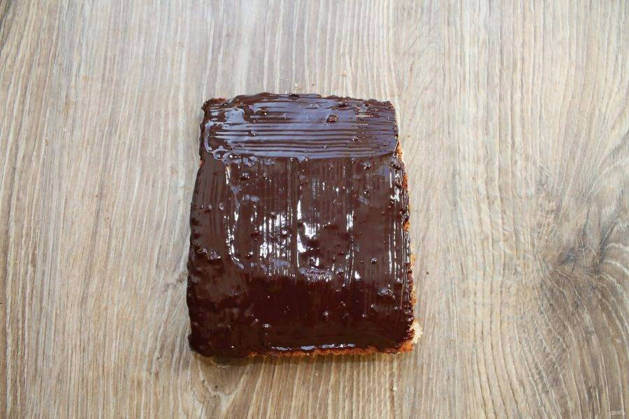 Каждую полоску бисквита, при помощи кисточки, пропитайте пропиткой и накройте шоколадной массой. Поставьте в холодное место, чтобы шоколад застыл.