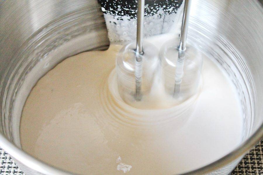 Продолжая взбивать, потихоньку всыпьте сахар и взбивайте на высокой скорости еще 10 минут до пышной, почти белой массы.