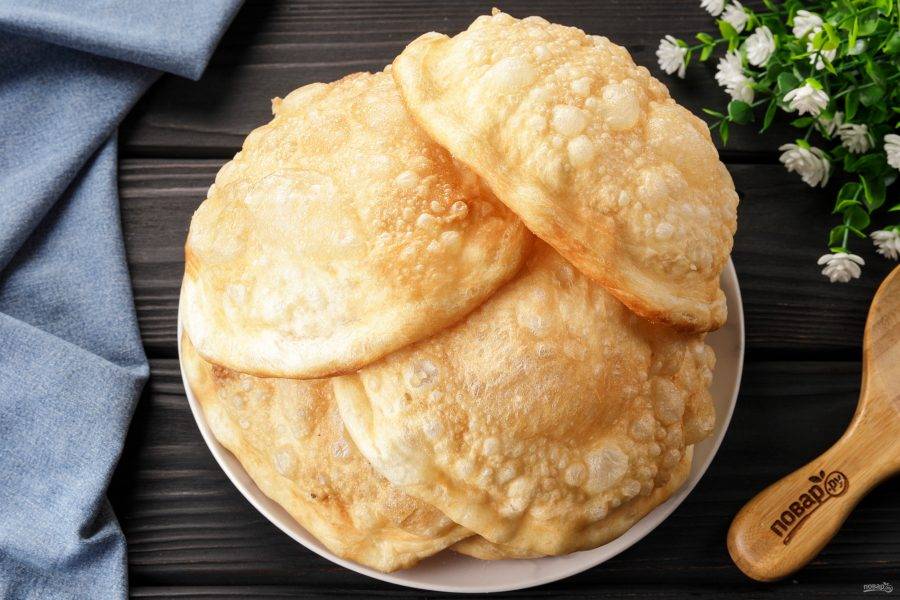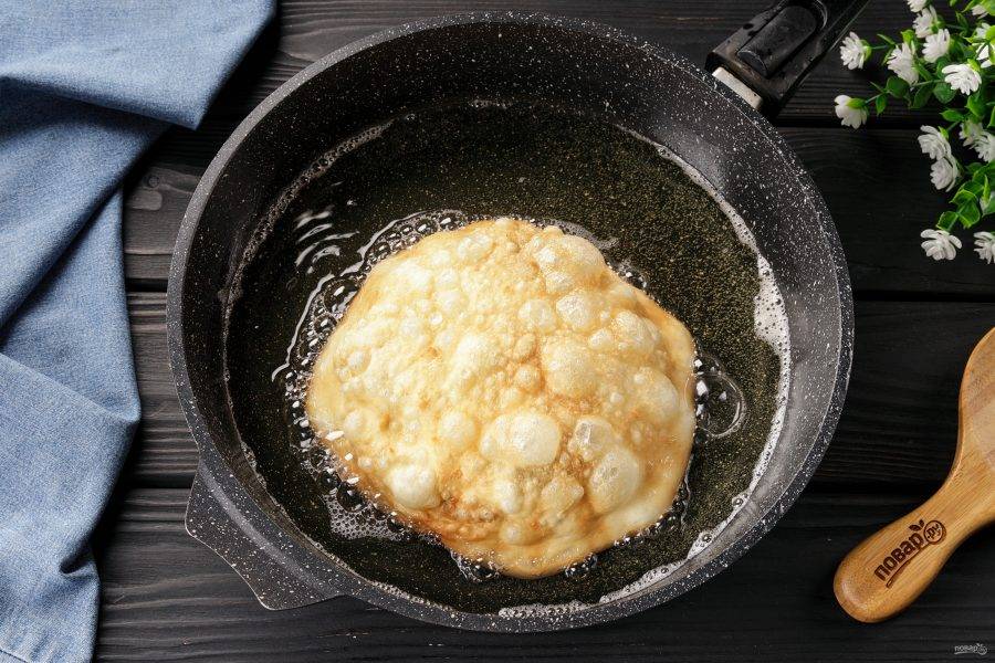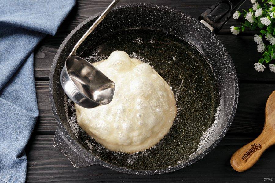 Жарьте баурсаки в глубокой сковороде или казане с большим количеством горячего растительного масла. Аккуратно положите лепешку в кипящее масло и жарьте постоянно поливая сверху половником этим же маслом, в котором жарится баурсак.