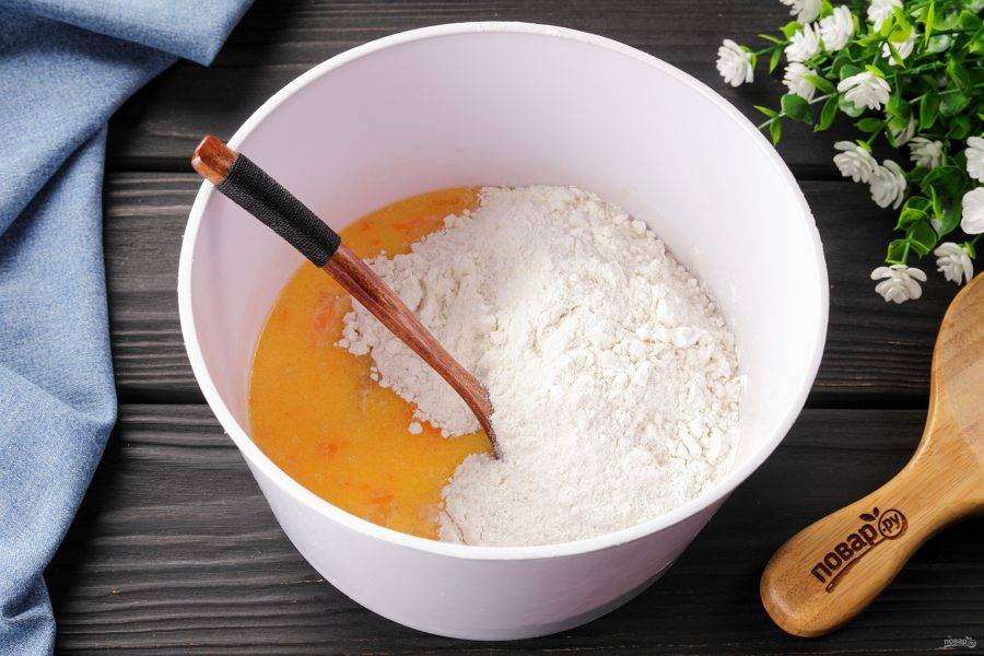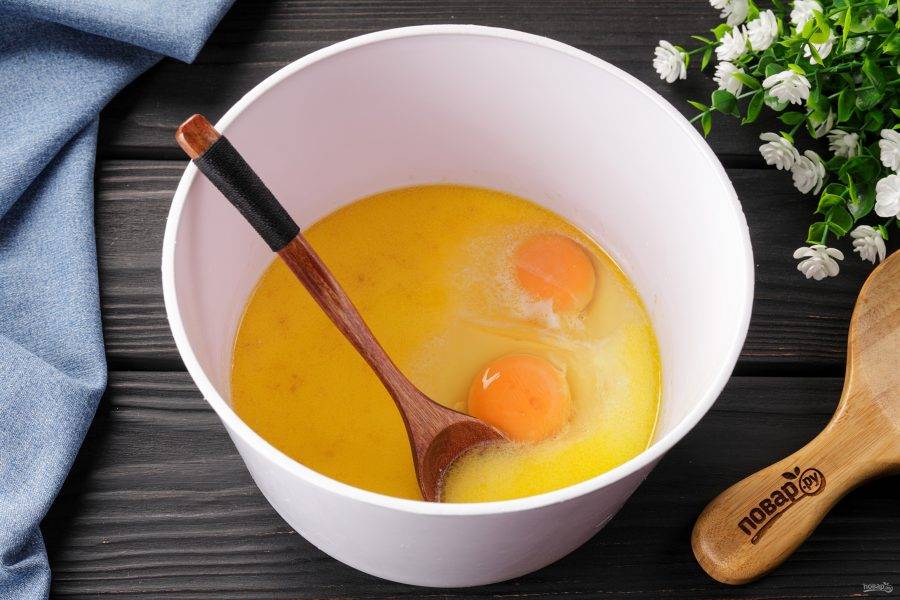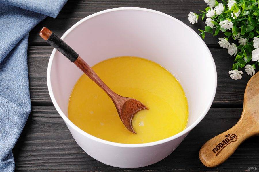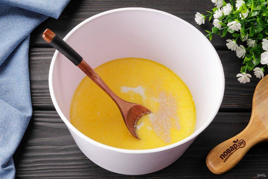 В глубокой миске соедините тёплое молоко и растопленное масло.