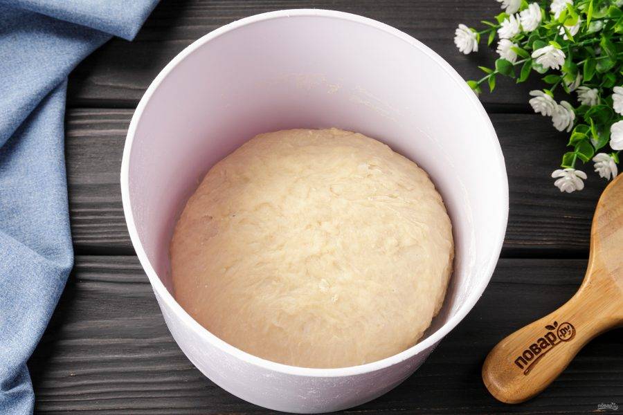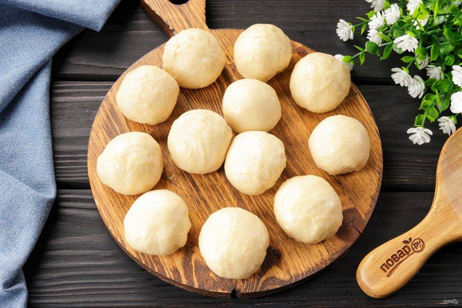 Тесто должно быть эластичное и не слишком крутое. Можно даже оставить его чуть липким, главное — не забить его мукой. Накройте тесто полотенцем и дайте ему полежать 15-20 минут, затем вымесите недолго ещё раз и разделите на шарики по 50-70 грамм.