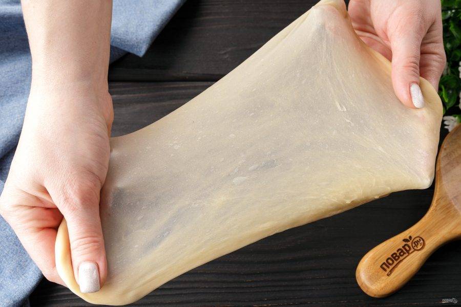 Затем раскатайте каждый шарик в лепешку толщиной примерно 5 мм. и аккуратно, стараясь не порвать пальцами, растяните тонко лепешку от середины к краю.