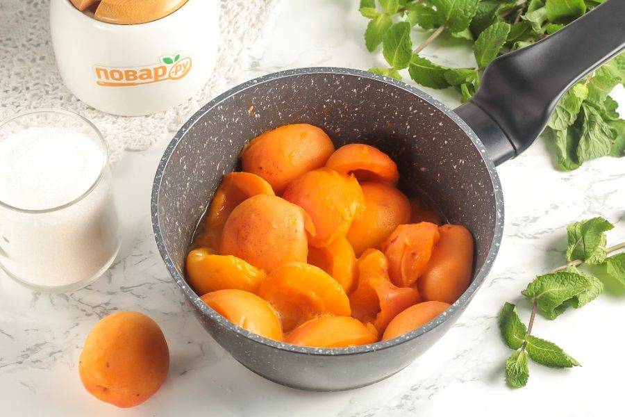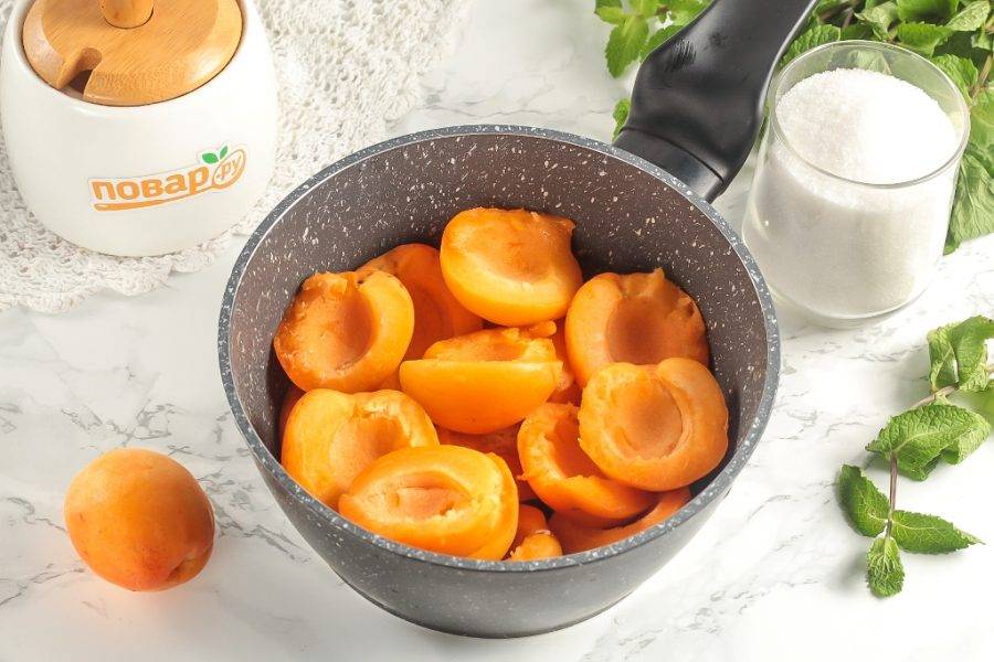 Абрикосы промойте в воде, удалите косточки и разрежьте пополам. Выложите половинки фруктов в казан или емкость с антипригарным дном. Поместите на плиту, включая умеренный нагрев.