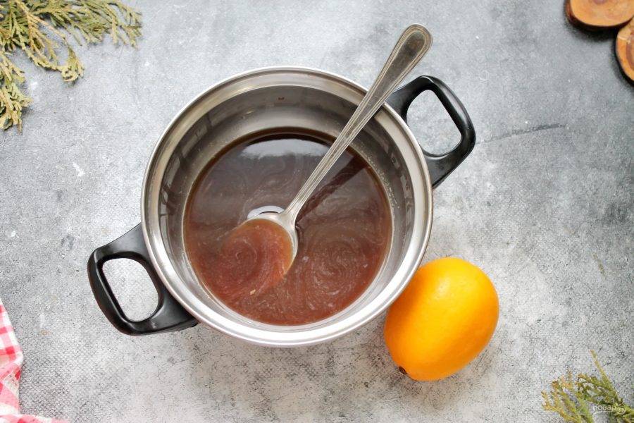 Перелейте сок в кастрюлю с толстым дном и поставьте на медленный огонь. Доведите температуру до 50 градусов и снимите с огня, сироп полностью остудите. Повторите процедуру еще два раза.