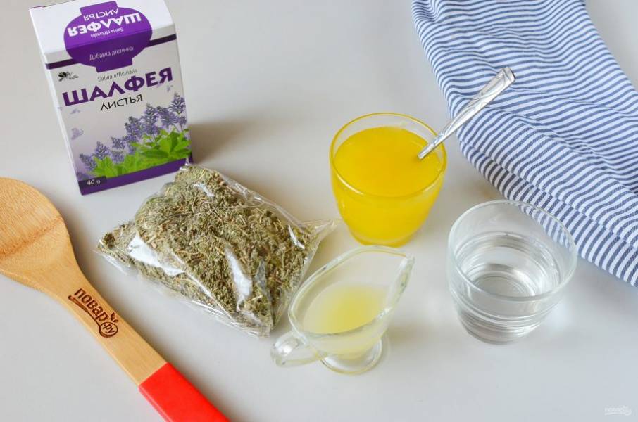 Вскипятите 100 мл. воды. Всыпьте 2 ст.л. шалфея, перемешайте. Накройте крышкой кастрюлю и настаивайте отвар 15 минут.