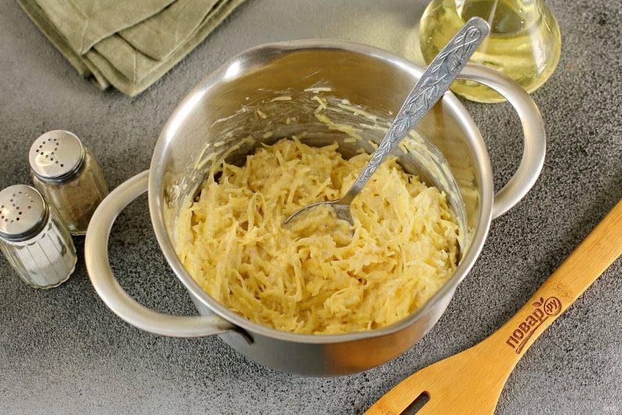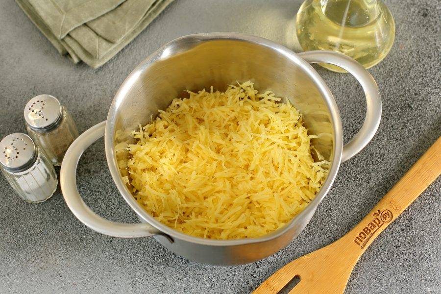 Картофель натрите на мелкой терке и отожмите.