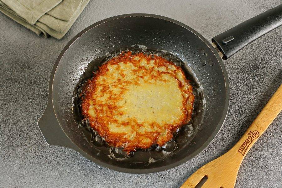 Затем на эту же сковороду выкладывайте частями тесто, разравнивая его ложкой и жарьте картофельные блинчики с двух сторон до золотистого цвета. Толщина должна быть небольшая, так блинчики останутся внутри нежные, а снаружи образуется хрустящая корочка. В процессе если необходимо, подливаем масло.
