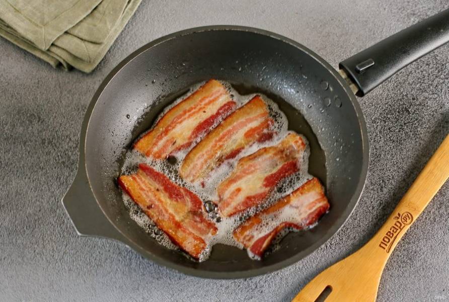 На сковороде обжарьте бекон с двух сторон.