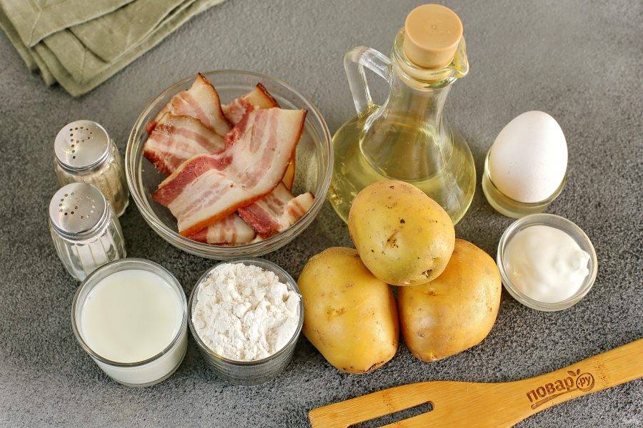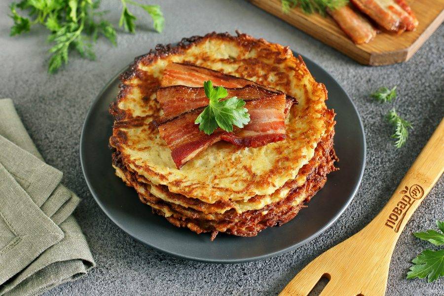 Готовые картофельные блины подавайте в дополнении с беконом или брусничным соусом. Приятного аппетита!