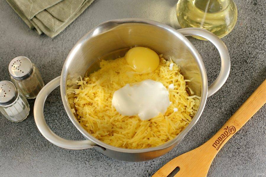 Добавьте сметану и яйцо.