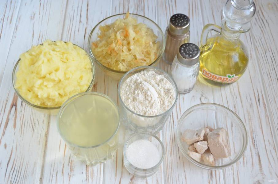 1. Подготовьте продукты для теста и начинку. Так как тесто очень быстрое, скороспелое, то начинка должна быть готова первой. У меня сегодня картофельное пюре и тушенная квашеная капуста.