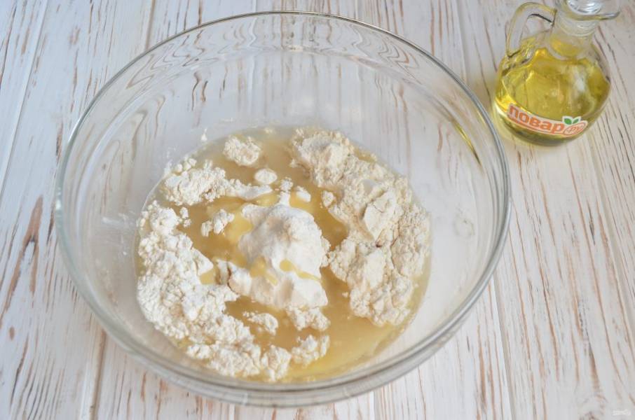 3. Влейте растительное масло, потом частями вводите муку, замешивайте тесто.