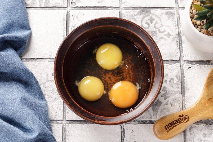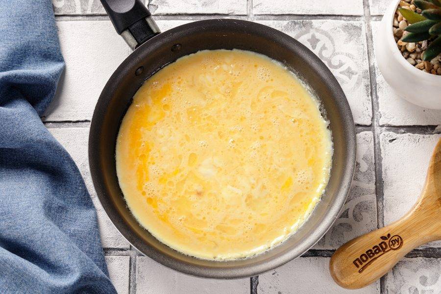 Когда масло растает, влейте яичную смесь. Огонь убавьте.