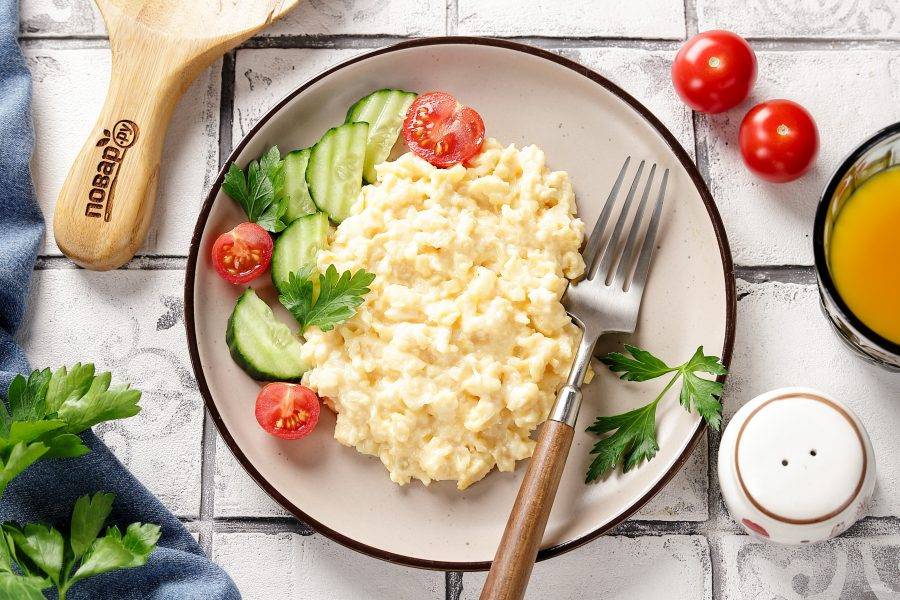 Скрэмбл готов. Я подавала с овощами. Приятного аппетита!