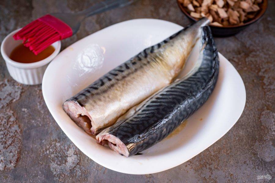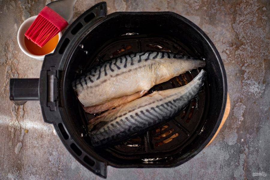 Поверх щепы установите решетку (нижнее положение), смажьте решетку тонким слоем растительного масла, выложите скумбрию. Чашу установите в аэрогриль и запустите в следующем режиме: температура — 180 градусов, время — 25 минут.