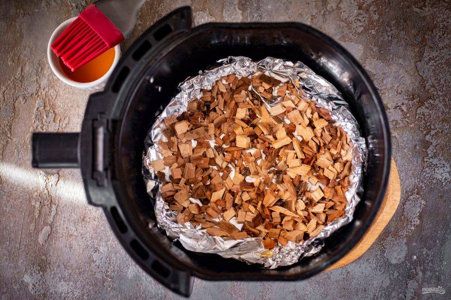 На дно чаши аэрогриля выстелите лист пищевой фольги и чуть подверните края, формируя небольшие бортики. Распределите по фольге щепу и сбрызните ее чуть жидким дымом с помощью кисти.
