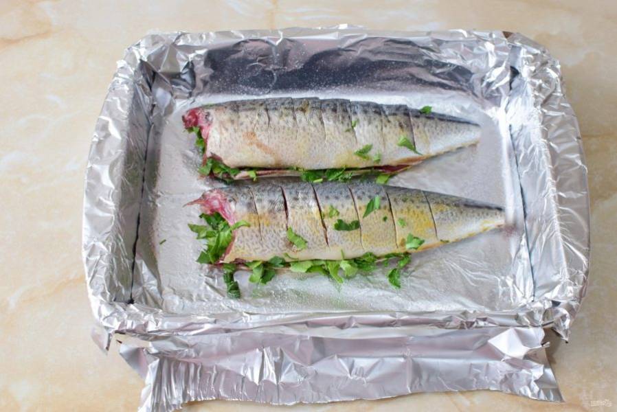 Форму для запекания застелите фольгой, смажьте растительным маслом и выложите рыбу.