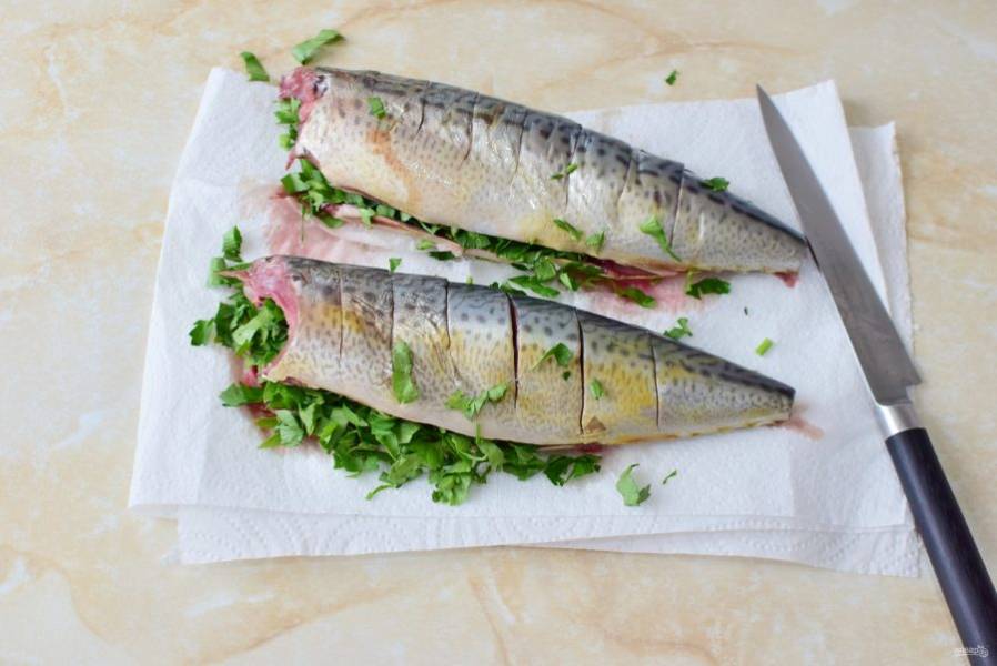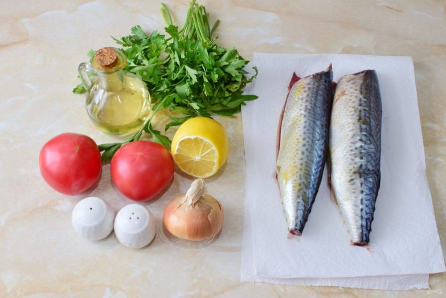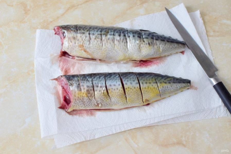 Перед началом приготовления подготовьте все необходимые ингредиенты. Скумбрию заранее очистите от внутренностей. Отрежьте голову и хвост. Промойте рыбу в проточной воде. Обсушите.
