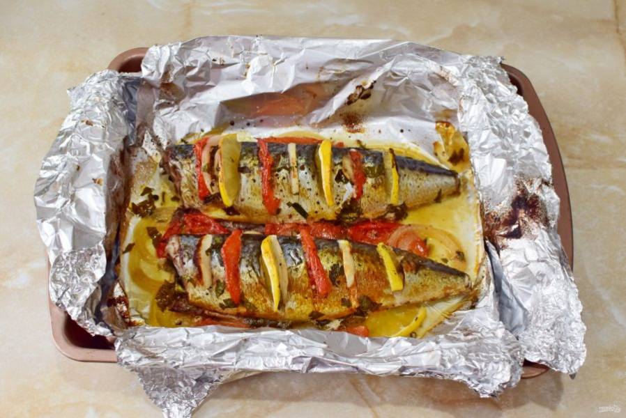 Готовую запеченную скумбрию выложите на тарелку и подавайте к столу.