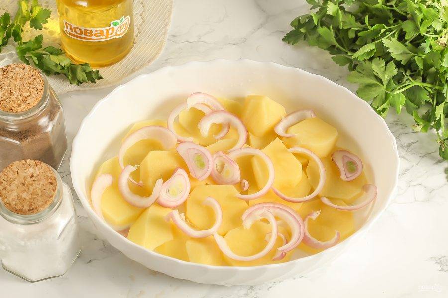 Нарежьте картофель слайсами толщиной 0,5 см., а лук — полукольцами. Смажьте форму растительным маслом и выложите в нее овощные нарезки.