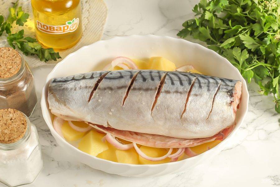 Срежьте у скумбрии голову, вспорите брюшко и удалите внутренности вместе с черной пленкой по бокам брюшка. Срежьте хвост и промойте тушку внутри и снаружи. Сделайте продольные надрезы. Посолите и поперчите рыбу.