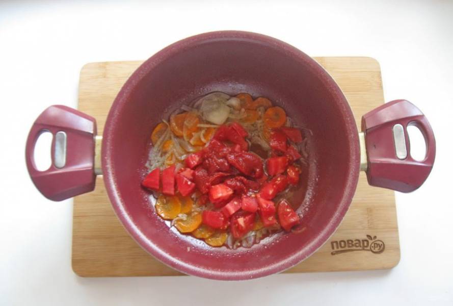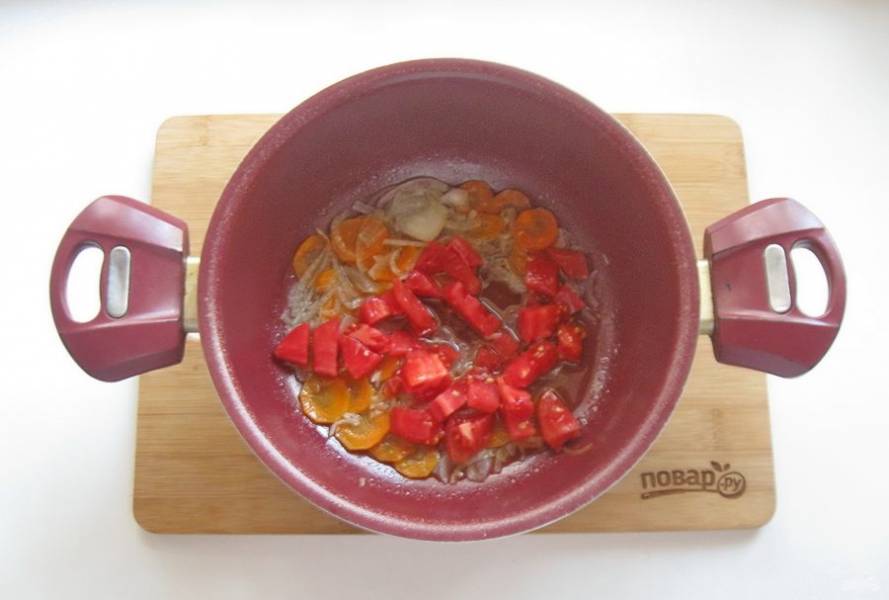 Помидор помойте, очистите от шкурки и нарежьте. Добавьте в кастрюлю с луком и морковью.