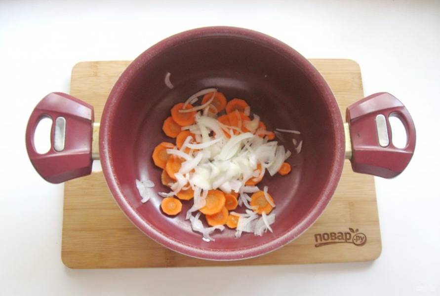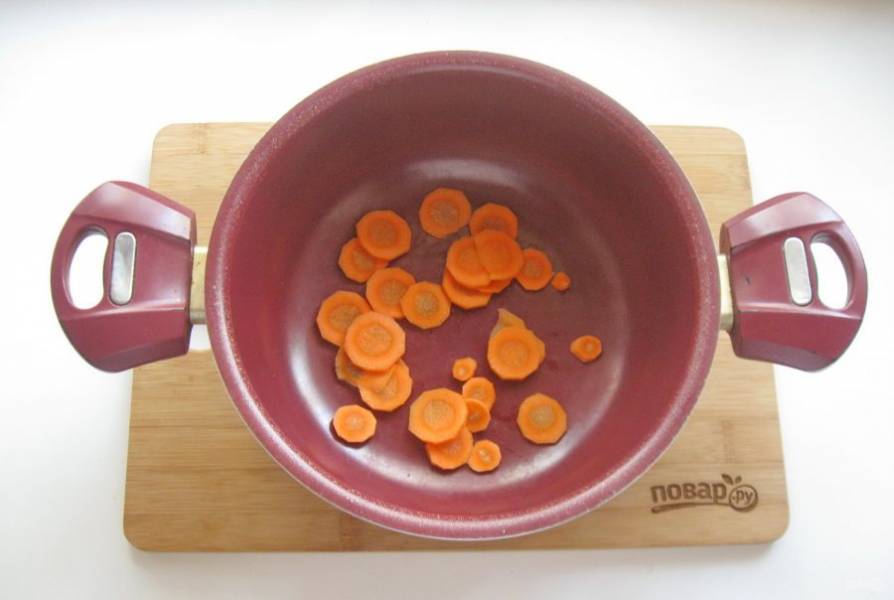 Морковь очистите, помойте и нарежьте. Выложите в кастрюлю с толстым дном.