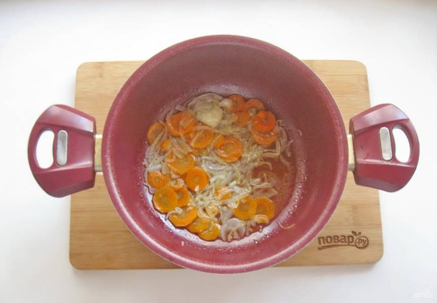 Налейте подсолнечное масло и тушите лук с морковью 10 минут, перемешивая.