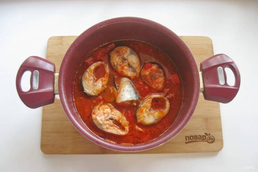 Накройте кастрюлю крышкой и тушите скумбрию на небольшом огне 20-25 минут.