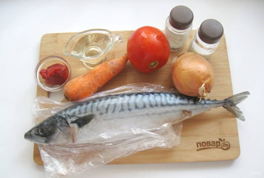 Подготовьте ингредиенты для приготовления скумбрии в томате.