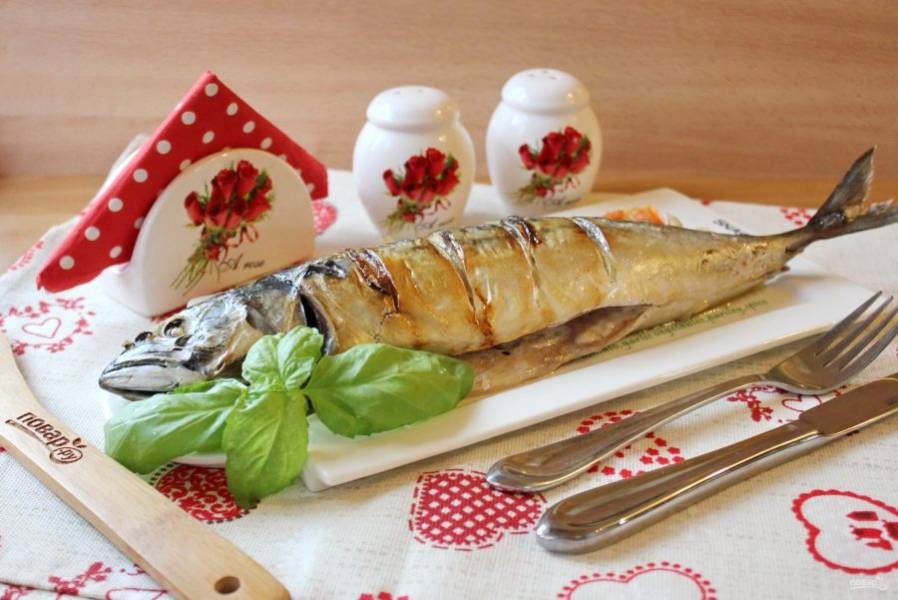 Запекайте скумбрию в пергаменте 20 минут. После его разверните и дайте рыбе подрумяниться еще 10-15 минут. Готовую скумбрию выложите на тарелку и подавайте к столу.