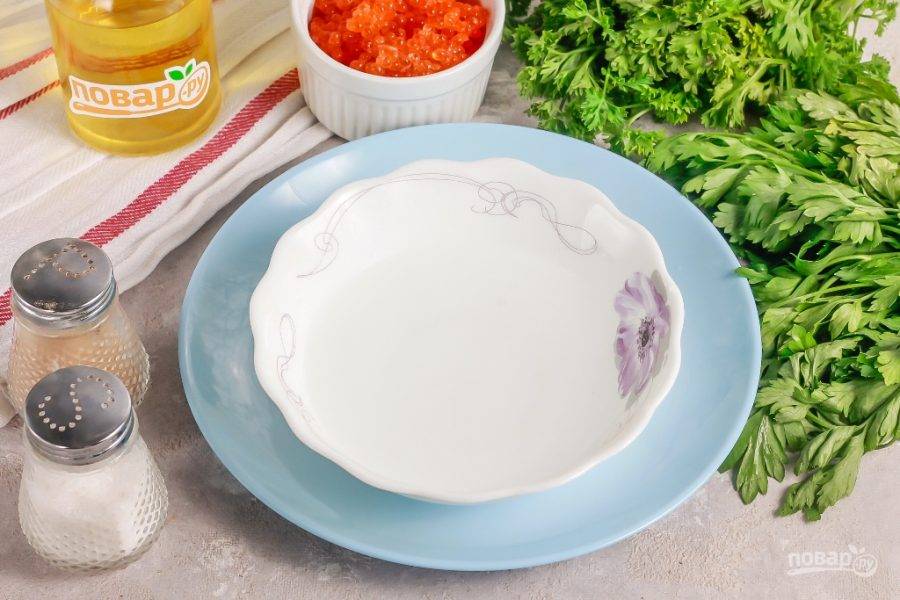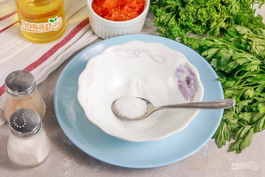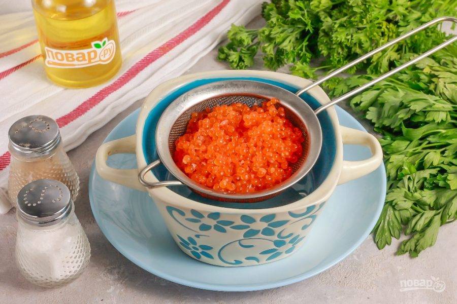 Подготовьте указанные ингредиенты. Икру можно использовать любую лососевую: семги, кеты, форели и т.д. Желательно перед засолкой очистить икру от пленок.