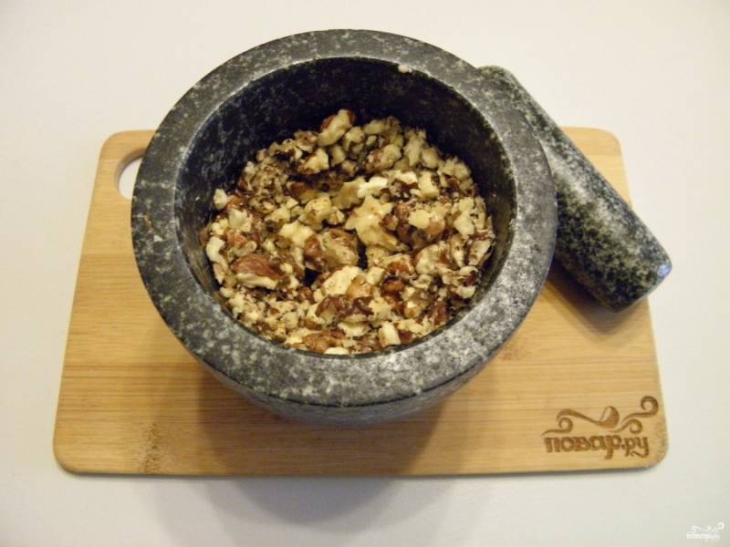 Грецкие орехи освободите от скорлупы. Подавите их в ступке, только не мелко, чтобы в готовой колбаске были видны кусочки.