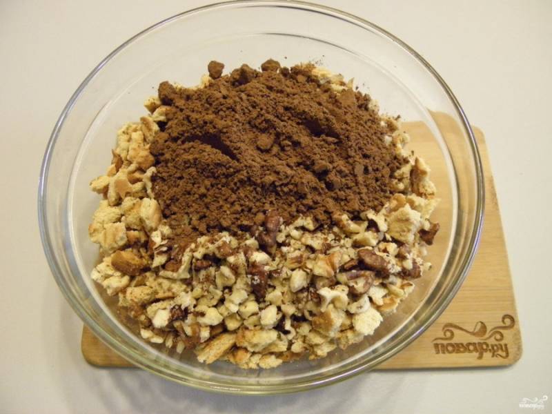 Печенье поломайте руками на мелкие кусочки, добавьте какао-порошок, грецкие орехи, все хорошенько перемешайте.
