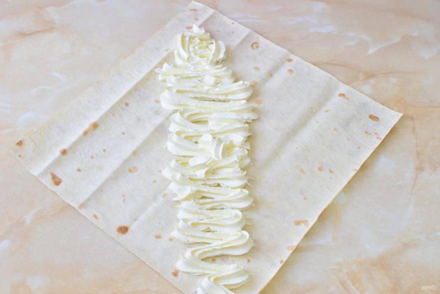 Лаваш разрежьте на кусочки необходимого размера. Нанесите на него крем.