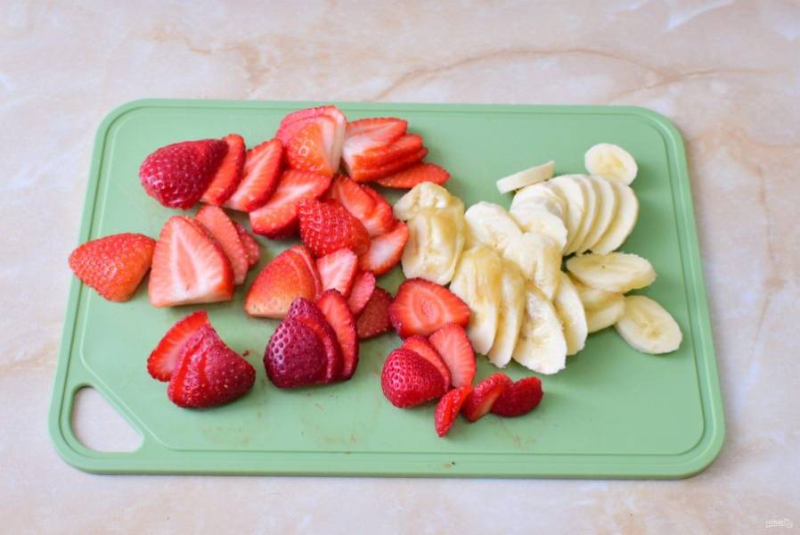 Ягоды и фрукты при необходимости помойте и обсушите. Затем нарежьте на дольки.